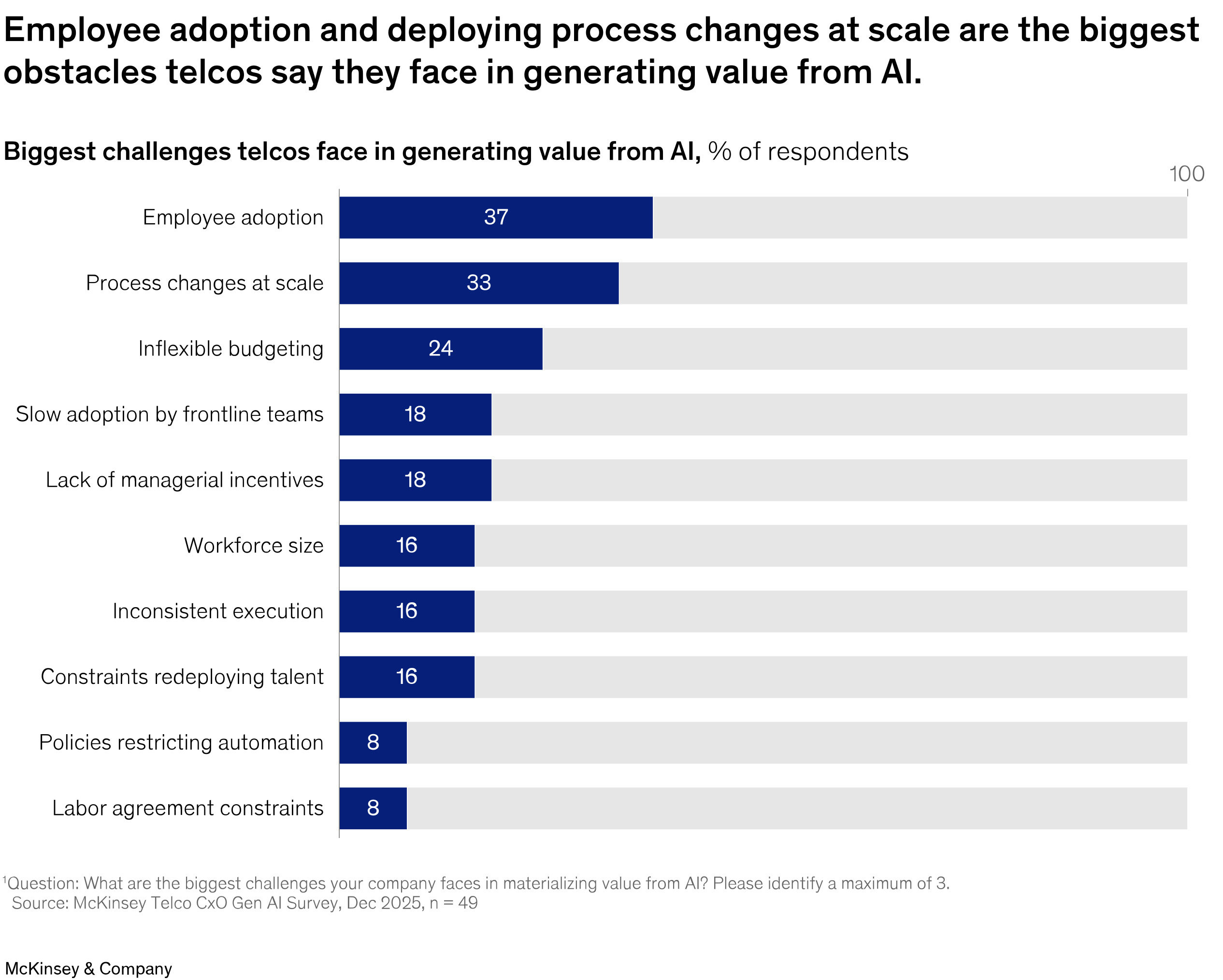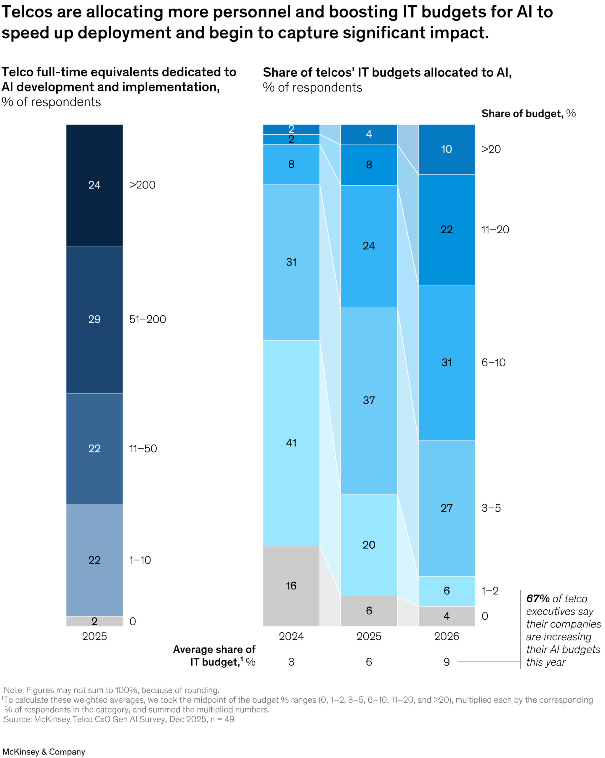 Fuente: Benjamim Vieira, Guilherme Cruz, Ignacio Ferrero, Tomás Lajous, Borja Belda, Daniela Mendoza y Manuel Palacios. «Telcos’ AI inflection point: What leaders do to capture value.» McKinsey & Company, Technology, Media & Telecommunications Practice, 26 de febrero de 2026. Disponible en: mckinsey.com